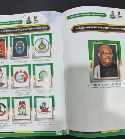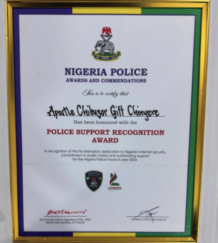 “The Nigerian President, His Excellency President Bola Ahmed Tinubu, GCFR ably represented by the President of the Senate and number 3 man in Nigeria His Excellency Distinguished Senator Godswill Obot Akpabio, GCON Presented award to HRM KING APOSTLE CHIBUZOR GIFT CHINYERE Founder /General Overseer Omega Power Ministries (OPM) in recognition of his invaluable support to the Nigerian Police Force in key areas of support for injured Police personnel, widows of officers killed in line of duty, renovation of some Police Infrastructure and overseas scholarships to children of Nigerian police officers who died in active service.”